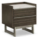 Clean lines lend sophistication and structure to this nightstand. Its complex rich grayish brown finish contrasts perfectly with a white marble top, while the streamlined silhouette features overlay slats to create visual interest. A metal base and bar pulls in a low-sheen steel finish add to this piece's contemporary vibe.
