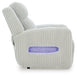 Trend-right style, meet irresistible modern function. Your living room gets a cozy-cool upgrade with this power recliner. Curl up in its ultra-chic corded upholstery and recline with one-touch controls. Is it movie night or game time? With ambient LED lighting, this recliner transforms from a serene relaxation spot to an entertainment hub. USB charging, cup holders and storage cutouts make lounging all the more convenient.