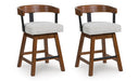 Made with select acacia veneers and hardwood solids. Gently distressed and burnished dark brown finish. D594-35 has a planked table design with thick-look tops and butterfly leaf. Seat covers in brown faux leather. Server features a working drawer along with 2 doors and wine storage. D594-42 table has storage base and removable leaf.