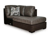 Living room lounging gets a dose of approachable luxury. This sleeper sectional with chaise is defined by supple faux leather in contrasting rich brown hues, creating a stylish monochromatic look with dimension. Guests dropping in? A built-in queen mattress easily accommodates overnighters. From morning coffee to late-night movie marathons, it's sure to elevate the everyday.