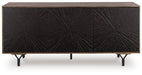 This accent cabinet combines classic function with elevated styling. Its ultra-sleek linear profile channels contemporary aesthetics, with the dark two-tone look lending a luxurious feel. Crafted with stunning mango wood, the carved sunburst pattern reflects superb attention to detail and refined craftsmanship. And for added function, push magnet doors gently open to reveal spacious storage.