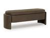 There’s more to this upholstered storage bench than what meets the eye. Its soft heathered brown upholstery provides a comfy sitting area. Lift the hinged seat to reveal lots of storage for pillows, blankets or other essentials. Coupled with its unique capsule shape, this bench is full of form and function.
