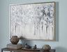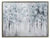 An abstract landscape piece in shades of blue, gray, and white designed to bring a calm, relaxed feeling into a home. This is a hand-painted, gallery-wrapped canvas with an abstract landscape design featuring natural elements like a "misty woodland glade".