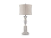 This table lamp takes a classic approach to tasteful lighting. Its detailed base ushers an air of elegance into your space with a graceful turn design. Outfitted with an antiqued white finish, it's right at home in traditional spaces. Pair with the matching floor lamp (sold separately) for double the style.
